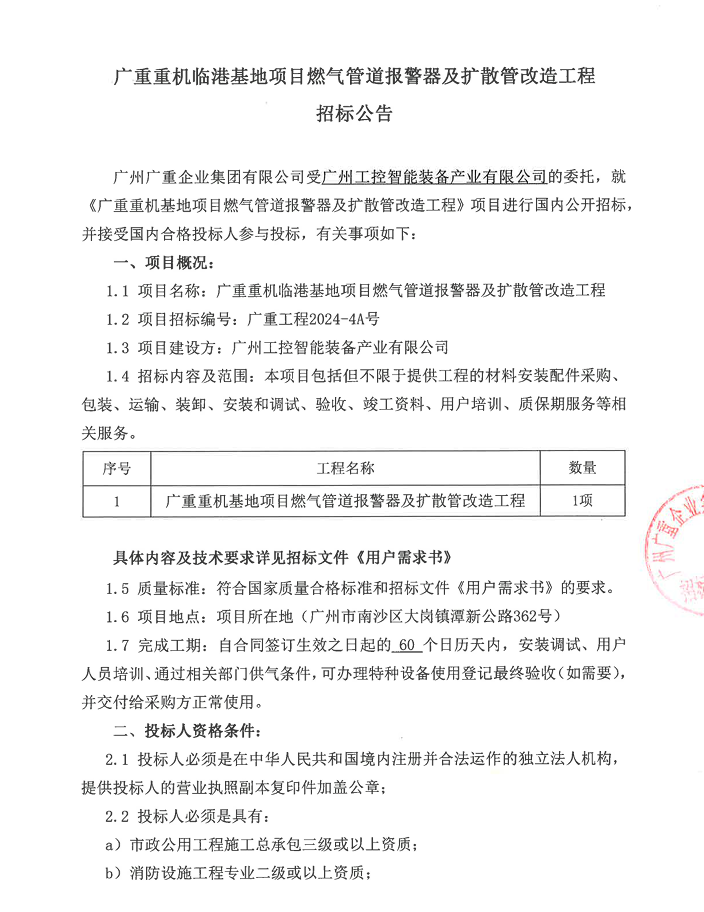 廣重重機(jī)臨港基地燃?xì)夤艿缊?bào)警器及擴(kuò)散管改造工程項(xiàng)目招標(biāo)公告