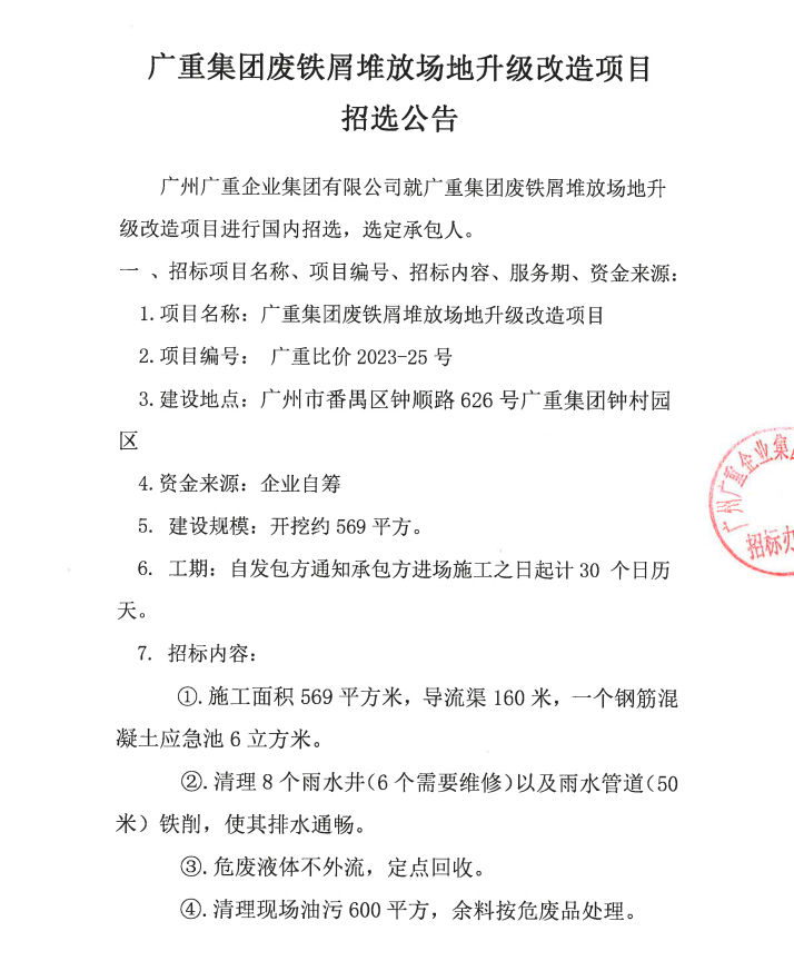 廣重集團(tuán)廢鐵屑堆放場地升級改造項目招選公告